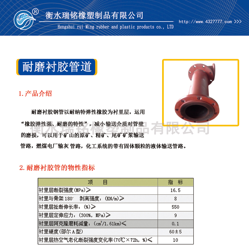 耐磨襯膠鋼管以耐納特彈性橡膠為襯里層,運用“橡膠彈性強、耐磨的特性”,減小輸送介質對管壁的磨損,可以用于礦山的原礦、精礦、尾礦礦漿輸送管路,燃煤電廠輸灰管路,化工系統的帶有固體顆粒的液體輸送管路。