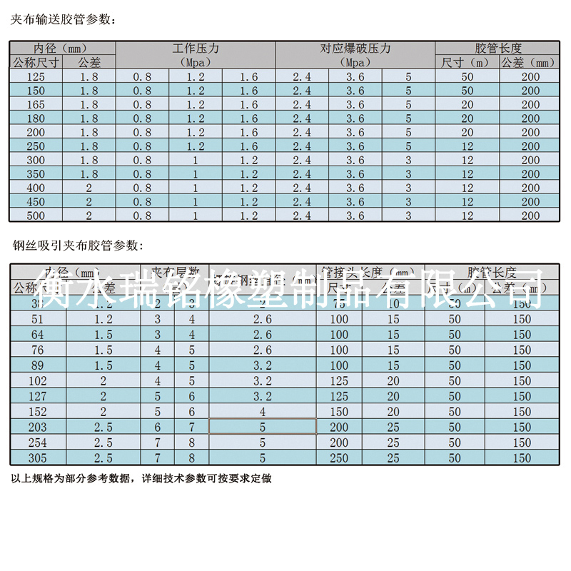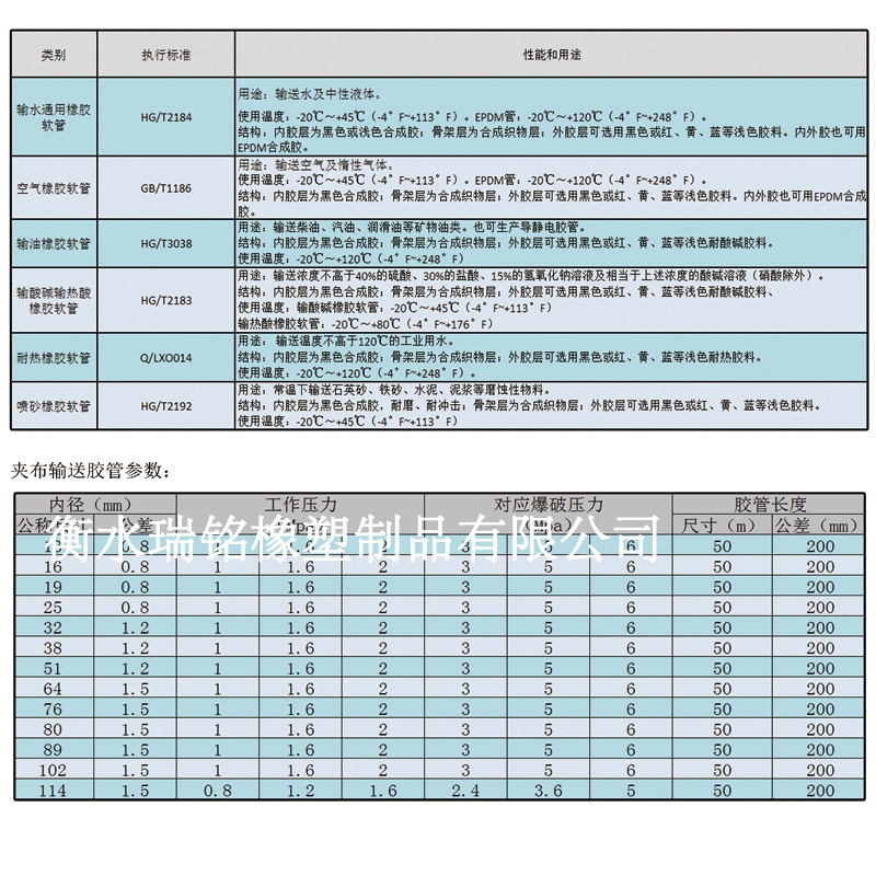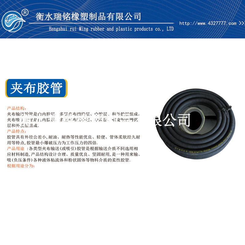 三、用途:各類型夾布膠管是根據輸送介質不同,選用相應材料制造,產品結構             設計合理、質量優良、堅固耐用,是一種用來輸送(正壓條件)各種液體粘流體和粉狀固體等物料介質的柔性膠              管。