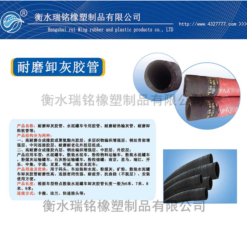 產品結構:散裝水泥罐車卸灰膠管由高耐磨合成橡膠或聚氨酯內膠層、多層織物編織增強層、中間連接膠層、耐磨耐老化外膠層組成。