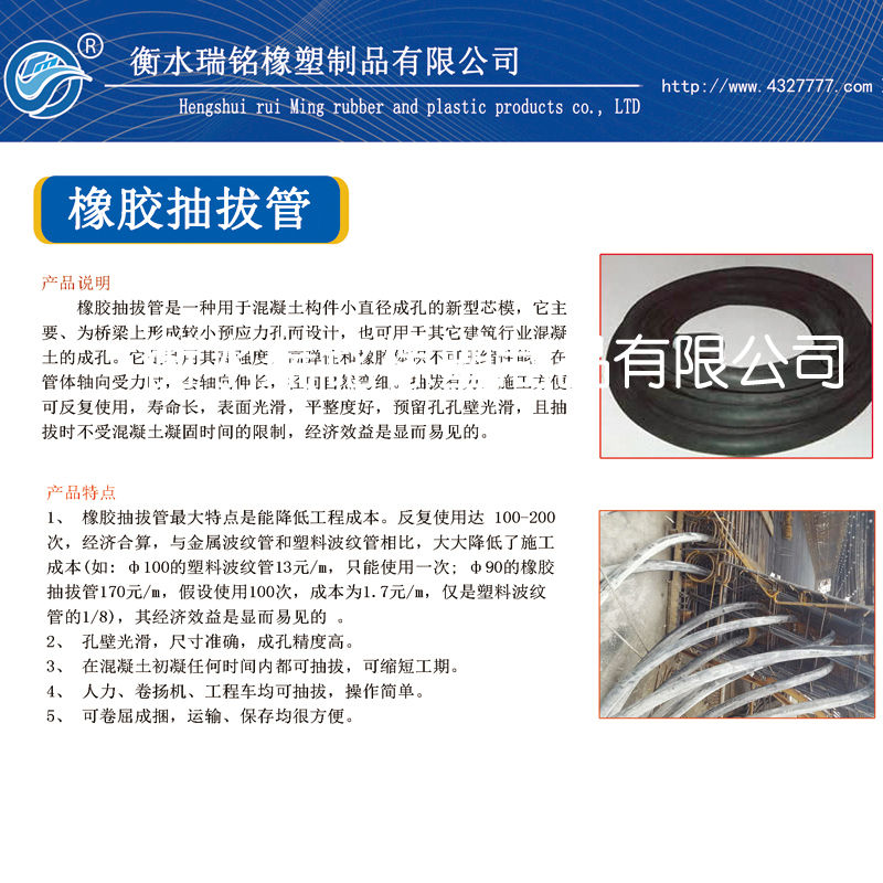 1、 橡膠抽拔管最大特點是能降低工程成本。反復使用達 100-200次,經濟合算,與金屬波紋管和塑料波紋管相比,大大降低了施工成本(如: ф100的塑料波紋管13元/m,只能使用一次; ф90的橡膠抽拔管170元/m,假設使用100次,成本為1.7元/m,僅是塑料波紋管的1/8),其經濟效益是顯而易見的 。