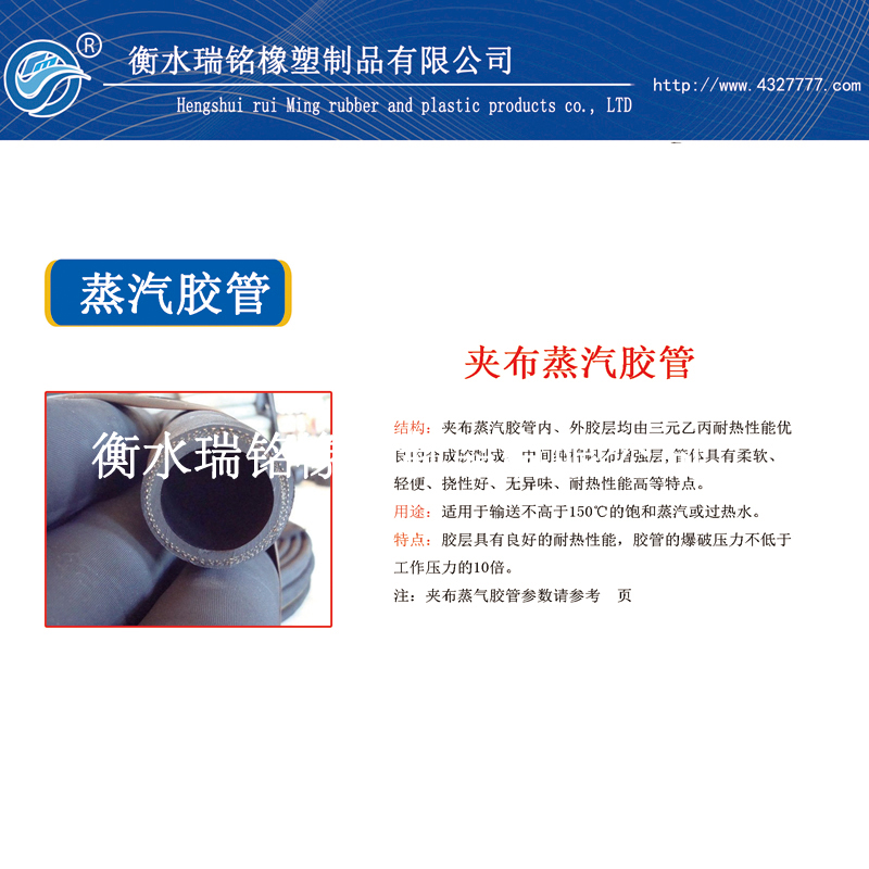 1.用途:供輸送165℃~220℃的飽和蒸汽或過熱水,適用於蒸汽清掃器,蒸汽錘,平板硫化機及注塑機等熱壓設備作軟性管路。 |